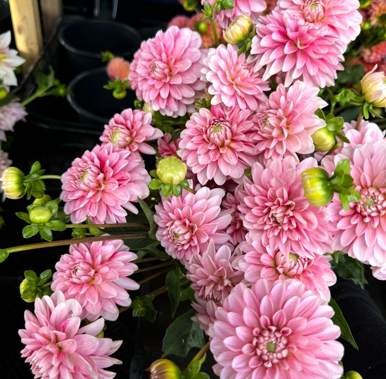 Our favorite light pink production variety. Lots of stems, smaller head size and the sweetest pinky/mageta color palette. It is basically the perfect dahlia for everything we need to do.