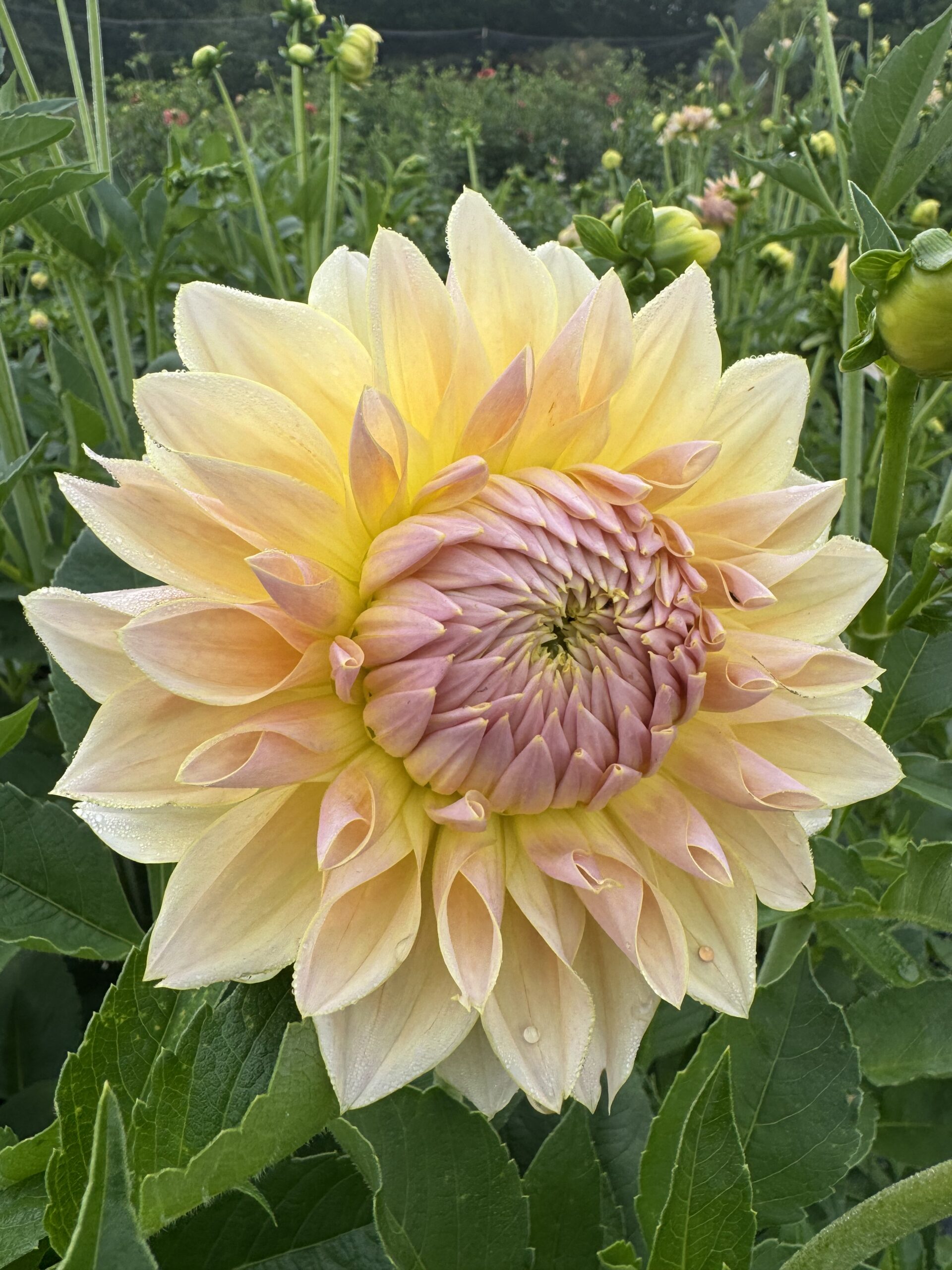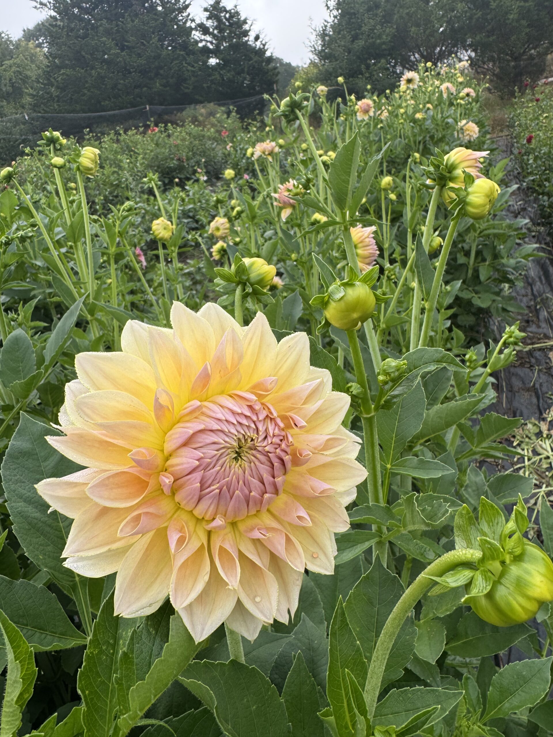 These are INSANE. A serious producer, SUPER tall and very strong stems. The flower heads are a large pom (not quite dinnerplate sized) and in a very soft and creamy yellow with blush center.